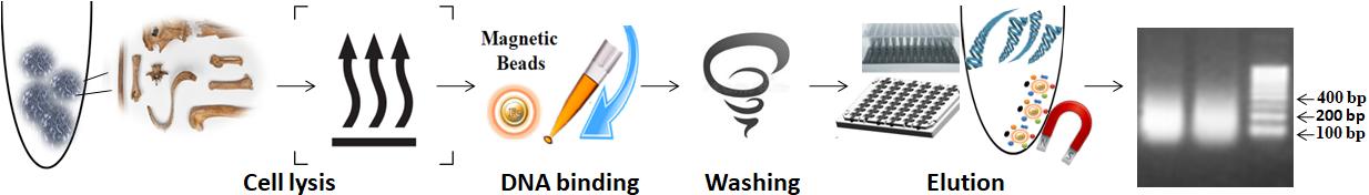 骨骼和牙齒通常是鑒定人類遺骸的唯一DNA樣本。從骨骼和牙齒中純化出DNA在許多分子生物學(xué)應(yīng)用中都很重要,包括法醫(yī)分析,古代DNA分析和遺傳研究。且從骨骼和牙齒等復(fù)雜樣品中有效提取DNA比使用新鮮的生物組織要困難得多。因?yàn)椋趋朗且环N高度組織化、復(fù)雜化和專門化的結(jié)締組織,具有極高的鈣離子濃度。骨中的大部分DNA存在于骨細(xì)胞中。由于骨骼是具有高鈣含量的剛性結(jié)締組織,骨骼和牙齒中的DNA通常比軟組織中的DNA保存得更好。而骨骼中的牙齒則由牙釉質(zhì)、牙本質(zhì)、牙骨質(zhì)和牙髓組織組成。牙本質(zhì)和牙髓都含有DNA。由于骨骼是高度礦化的組織,選擇有效的DNA提取方式,對(duì)于消除PCR抑制劑和避免DNA提取溶液中參雜過多礦物至關(guān)重要。