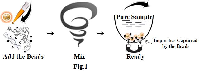 該方案操作簡單:僅需一管,一步,一分鐘(圖1)。將磁珠直接添加到待純化的DNA/RNA樣品中,通過渦旋或移液以捕獲和去除雜質(zhì)。渦旋/移液后,磁珠被磁力架捕獲,而上清液中含有純化的,可進(jìn)行下有反應(yīng)的樣品。磁珠適用于DNA/RNA片段,質(zhì)粒DNA和基因組DNA。