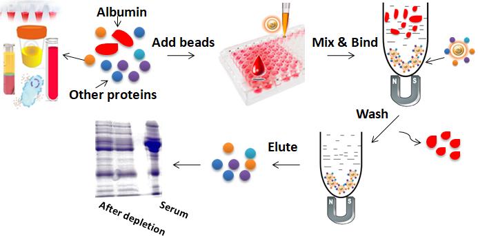 人類血清或血漿包含豐富的蛋白質(zhì)組學(xué)信息,這些蛋白質(zhì)經(jīng)常被用于分析機體是正常或病理狀態(tài)的蛋白質(zhì)生物標(biāo)記物。人類血清中所含有的大量的,種類眾多的蛋白質(zhì)是血液蛋白質(zhì)研究中最具挑戰(zhàn)性的障礙之一。大量表達的蛋白質(zhì),如白蛋白和IgG,占血清/血漿總蛋白質(zhì)的70%。而蛋白質(zhì)生物標(biāo)記物的含量則要低得多(pg/ml)。高豐度蛋白質(zhì)會隱藏需要研究的低豐度蛋白質(zhì),對一維和二維電泳、高效液相色譜和質(zhì)譜分析等分析實驗造成影響。高豐度蛋白質(zhì)必須有效、可重復(fù)并明確地從血液樣本中去除掉,才可以正確的檢測低豐度蛋白質(zhì)。因此,在進行蛋白質(zhì)組分析之前,特別是使用質(zhì)譜法時,有必要從人體樣品(如血漿、血清、尿液或腦脊液)中選擇性去除白蛋白。