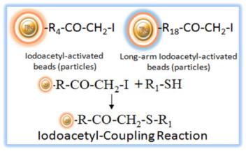 BcMag ? 可分離式碘代乙?;罨胖椋▓D2)是均勻的二氧化硅基質(zhì)的超順磁珠,表面連接有高密度的碘乙?;蚩闪呀獾牡庖阴;倌軋F(tuán)。在堿性生理環(huán)境(pH 7.2--9)下,在含有20-30%DMSO或DMF的水性或有機(jī)溶劑中,碘代乙酰基活化的載體與巰基反應(yīng),產(chǎn)生穩(wěn)定的硫醚鍵。這些反應(yīng)通常在黑暗環(huán)境下進(jìn)行,以防止游離碘的形成,因?yàn)橛坞x碘可與酪氨酸,組氨酸和色氨酸殘基反應(yīng)。