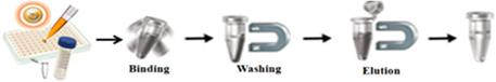 碘代乙?;胖樽鳛楣腆w載體可以完美地用于各種親和純化,將分子,細(xì)胞和部分細(xì)胞進(jìn)行純化。只需要與配體結(jié)合后,將磁珠添加到含有目標(biāo)分子的溶液中,然后混合,孵育,清洗和洗脫目標(biāo)分子(圖3)